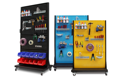配置:配2塊百頁掛板,4塊方孔掛板,底部可配兩定向兩萬向帶剎車輪。